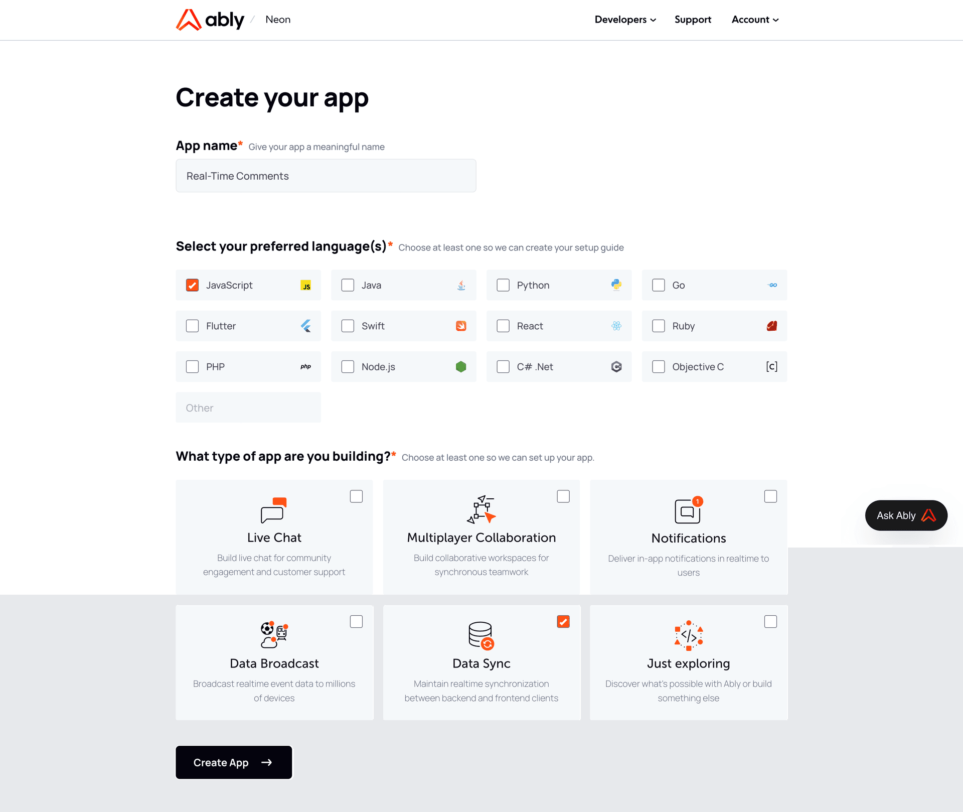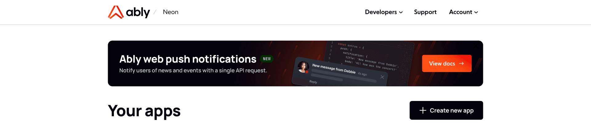 Sign in into the Ably Dashboard, and click on + Create new app.