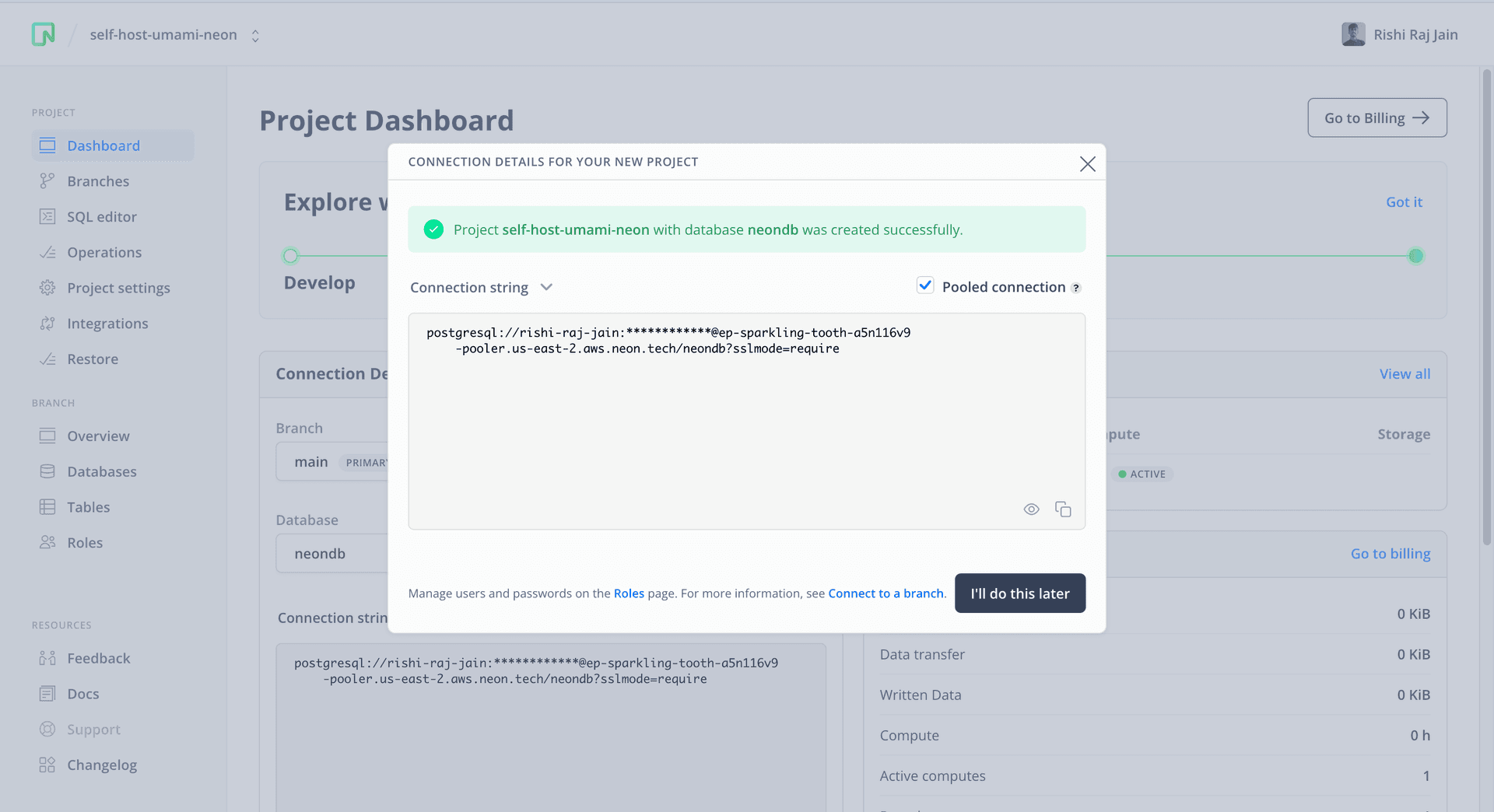 Please save the connection string somewhere safe. Later, you will use it to configure the DATABASE_URL variable.
